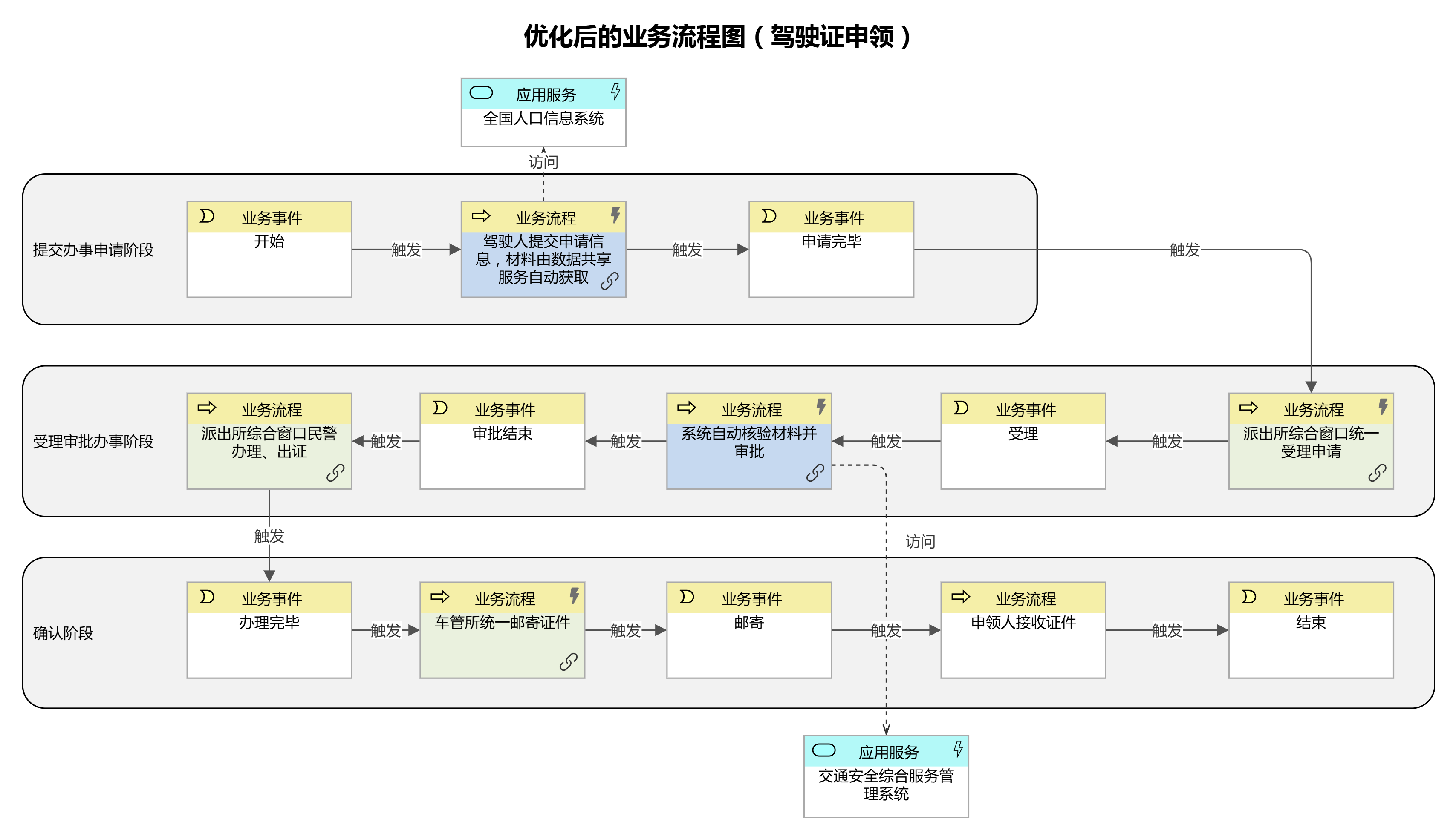 優化業務流程:謀劃好可集成的數據、可協同的部門后即完成了多跨場景的集成過程。集成后形成的新流程活動替換現行活動,實現流程的再造。再造流程將解決重大需求中描述的“堵點”、“卡點”問題,因此新流程中的創新活動、智能活動就是需要改革的項目。